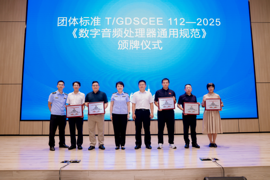 會議結(jié)束后,廣州市市場監(jiān)管局標準化處副處長房鵬飛、番禺區(qū)市場監(jiān)管局副局長蔣麗娟、標準化科科長張小鋒為團體標準《數(shù)字音頻處理器通用規(guī)范》主要起草單位代表頒發(fā)榮譽牌匾。整場活動主題鮮明、內(nèi)容充實、成果豐碩,不僅全面展示了番禺區(qū)標準化工作的卓越成就,更凝聚了社會各界對標準化事業(yè)的共識與合力。
